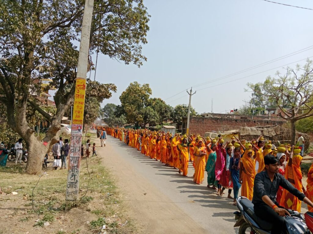 सोनभद्र जिले के नगवां विकास खंड के वैनी में आयोजित श्री शतचंडी महायज्ञ के शुभारंभ के अवसर पर रविवार को भव्य कलश यात्रा निकाली गई। श्रद्धा और भक्ति के रंग में रंगी इस यात्रा में हजारों श्रद्धालुओं ने भाग लिया।