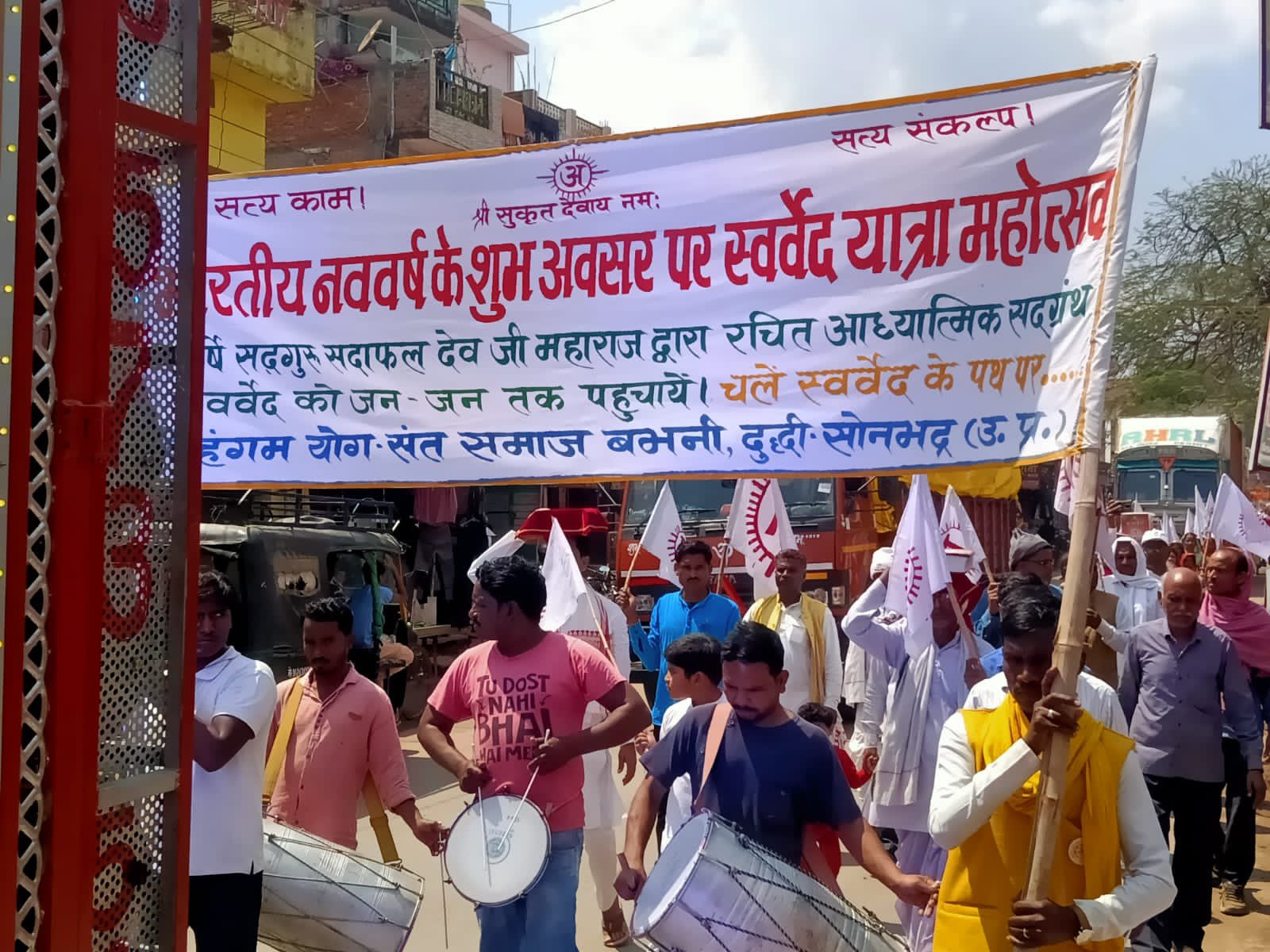 दुद्धी सोनभद्र नगर पंचायत अंतर्गत महर्षि सद्गुरु सदाफल देव जी महाराज के अनुयायियों द्वारा महर्षि द्वारा रचित आध्यात्मिक धर्म ग्रंथ स्वर्वेद के विचारधारा को जन जन तक पहुंचाने आध्यात्मिक धर्म ग्रंथ को जीवन में उतारने ” चलें स्वर्वेद के पथ पर ” विहंगम संत समाज बभनी, दुद्धी, के अनुयायियों द्वारा ढोल नगाड़े के साथ झांकी महर्षि सद्गुरु सदाफल देव जी महाराज के अनुयायियों द्वारा रथ पर निकाली गई।