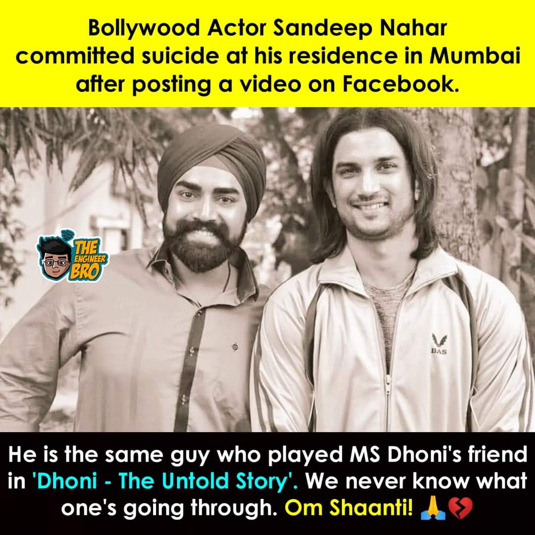 सुशांत सिंह राजपूत की फिल्म ‘एमएस धोनी द अनटोल्ड स्टोरी’ में काम कर चुके एक्टर संदीप नाहर ने आत्महत्या कर ली है। एक्टर ने फिल्म ‘केसरी’ और कई टीवी सीरियल्स में काम किया था। मुंबई पुलिस से मिली जानकारी के अनुसार, नाहर ने मुंबई के गोरेगांव स्थित अपने घर में आत्महत्या कर ली। पुलिस मामला दर्ज कर जांच में जुट गई है।
