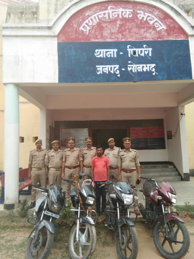 सोनभद्र। जनपद सोनभद्र में दो पहिया वाहन अज्ञात चोर द्वारा चोरी की जा रही है, इस पर प्रभावी रोकथाम लगाने तथा वाहन चोरी की घटनाओं के शीघ्र अनावरण व उसमें संलिप्त अपराधियों की गिरफ्तारी हेतु चलाये जा रहे अभियान के क्रम में आज दिनांक 28.06.2022 को थाना पिपरी पुलिस द्वारा मुर्धवा तिराहे पर संदिग्ध वाहनों व व्यक्तियों की गहनता से चेकिंग की जा रही थी, इस दौरान 01 नफर अभियुक्त मु0 नौशाद सिद्दिकी उर्फ रेहान पुत्र स्व0 समीम सिद्दीकी निवासी डुमरडिहा, थाना दुद्धी, जनपद सोनभद्र को गिरफ्तार कर उसके कब्जे से थाना स्थानीय पर पंजीकृत मु0अ0सं0-62/2022 धारा 379 भादवि से सम्बन्धित चोरी की गयी 01 अदद मोटर साइकिल संख्या-MP 66 MD 7944 बरामद किया गया । पूछताछ में अभियुक्त द्वारा बताये गये उसके निशानदेही पर 03 अदद चोरी की मोटर साईकिल तथा इस प्रकार कुल 04 अदद मोटर साइकिल बरामद कर अभियुक्त उपरोक्त को मा0 न्यायालय भेजा गया। उल्लेखनीय है कि उपरोक्त बरामद मोटर साइकिलों में से 02 मोटर साइकिल थाना पिपरी के मु0अ0सं0-62/2022 व 74/2022 से तथा शेष 02 मोटर साइकिल थाना अनपरा, जनपद सोनभद्र पर पंजीकृत अभियोग से सम्बन्धित है।