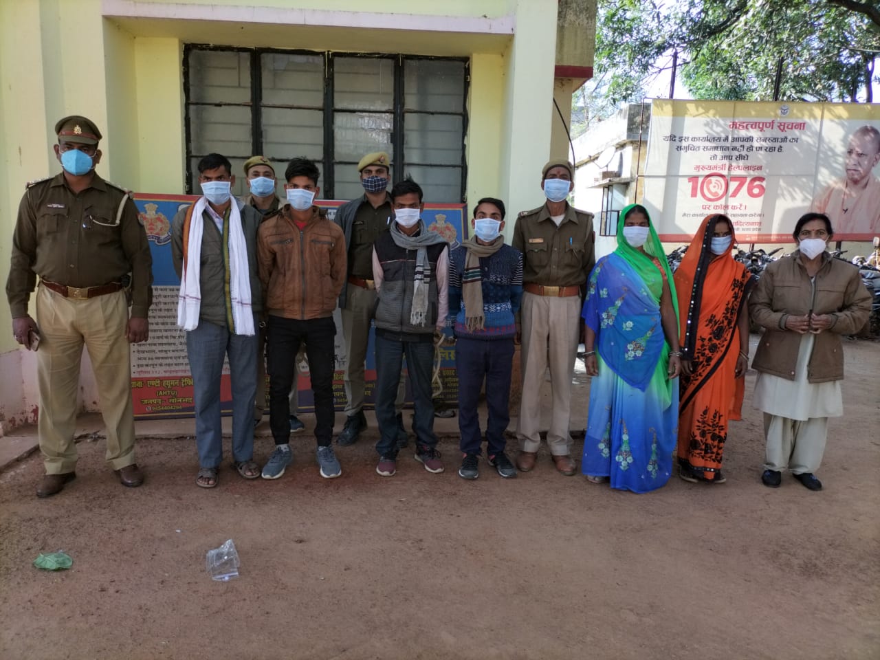 इस टीम द्वारा आज दिनांक 08.12.2021 को प्रातः ही उपरोक्त घटना में संलिप्त 06 अभियुक्त/अभियुक्ता क्रमश 1- प्रेमनाथ विश्वकर्मा पुत्र बेचन विश्वकर्मा, 2- बाबूलाल विश्वकर्मा पुत्र बेचन विश्वकर्मा, 3- विजय विश्वकर्मा पुत्र सीताराम विश्वकर्मा, 4- रवि विश्वकर्मा पुत्र प्रेमनाथ विश्वकर्मा, 5- आशा पत्नी प्रेमनाथ विश्वकर्मा 6- अनीता पत्नी बाबूलाल विश्वकर्मा समस्त निवासीगण-ग्राम चौखड़ा थाना रायपुर सोनभद्र को ग्राम चौखड़ा तिराहा के पास से गिरफ्तार कर मा0 न्यायालय भेजा गया ।