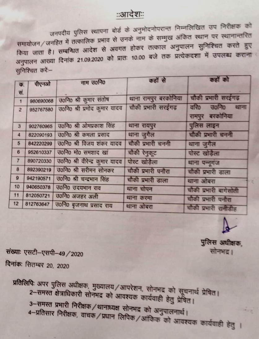 जनपदीय पुलिस स्थापना बोर्ड के अनुमोदनोपरान्त पुलिस अधीक्षक(SP) सोनभद्र आशीष श्रीवास्तव के आदेशानुसार जिले के विभिन्न थानों से 12 उपनिरीक्षकों का स्थानानंतरण जनहित में किया गया है। 21 सितम्बर 2020 को प्रात: 10 बजे तक अनुपालन आख्या उपलब्ध कराने हेतु निर्देशित किया गया है।