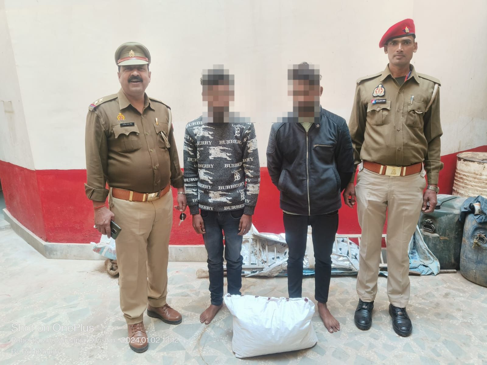 पुलिस अधीक्षक सोनभद्र द्वारा अवैध मादक पदार्थों की तस्करी करने वाले तस्करों के विरुद्ध अभियान चलाया गया है, इसी के क्रम में अपर पुलिस अधीक्षक (मुख्यालय) तथा क्षेत्राधिकारी नगर के आदेश के क्रम मे आज मंगलवार को थाना रॉबर्ट्सगंज पुलिस द्वारा संदिग्ध व्यक्तियों एवं वाहनों की चेकिंग के दौरान वाराणसी- शक्तिनगर राज मार्ग से लगभग 200 मीटर ग्राम गेंगूआर से एक आपचे मोटरसाइकिल पर सवार 02 व्यक्तियोंरवि कुमार गुप्ता उर्फ संदीप उर्फ कल्लू पुत्र राजेन्द्र प्रसाद उम्र करीब 21 वर्ष,आकाश सोनकर पुत्र प्रेमलाल निवासी चण्डी होटल, थाना रॉबर्ट्सगंज, जनपद सोनभद्र उम्र करीब 20 वर्ष । द्वारा 01 बोरी में बेचने हेतु ले जा रहे कुल 07 किग्रा गांजा के साथ गिरफ्तार कर लिया गया । उक्त बरामदगी व गिरफ्तारी के आधार पर थाना रॉबर्ट्सगंज पर मु0अ0सं0 11/2024 धारा 8/20 एनडीपीएस एक्ट का अभियोग पंजीकृत कर गिरफ्तार अभियुक्तगण उपरोक्त को माननीय न्यायालय भेजा गया।