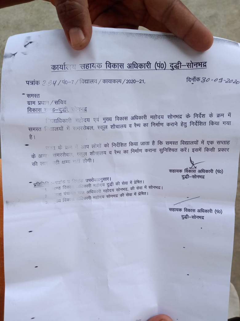 दुद्धी सोनभद्र विकासखंड अंतर्गत उत्तर प्रदेश सरकार के महत्वपूर्ण उपक्रम कायाकल्प योजना के अंतर्गत विद्यालयों के जीर्णोद्धार एवं आधुनिकीकरण को लेकर एक सप्ताह के अंतर्गत हैंडपंप में समरसेबल , विद्यालय के सीढ़ियों पर रेम्प, शौचालय , और विद्युतीकरण ,वेस्ट मैनेजमेंट आदि व्यवस्थाओं को लेकर सख्त हुए खंड विकास अधिकारी।