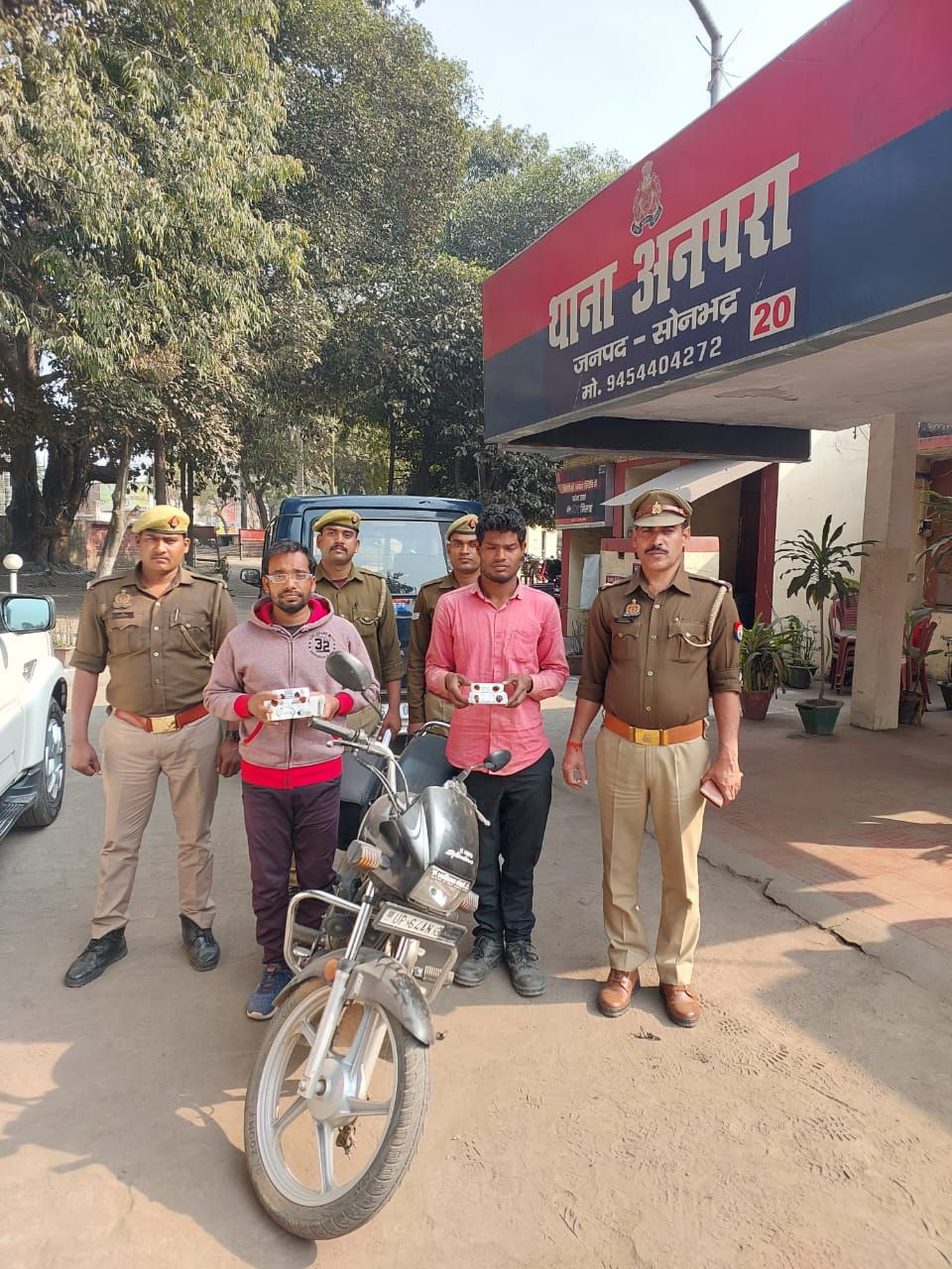 सोनभद्र जनपद अन्तर्गत आगामी लोकसभा चुनाव के मद्देनर मादक पदार्थों की रोकथाम के लिए पुलिस द्वारा चलाए जा रहे अभियान के क्रम में अंतराज्जीय बॉर्डर पर सघन चेकिंग के दौरान अनपरा पुलिस टीम द्वारा दिनांक 23 जनवरी 2024 दिन मंगलवार को प्रातः 8.30 बजे मध्य्प्रदेश बार्डर दुल्लापाथर से हीरो स्प्लेंडर प्लस UP 64 AN 3791 पर सवार दो अभियुक्तों को 210 ग्राम हीरोइन के साथ टीम ने गिरफ्तार किया |