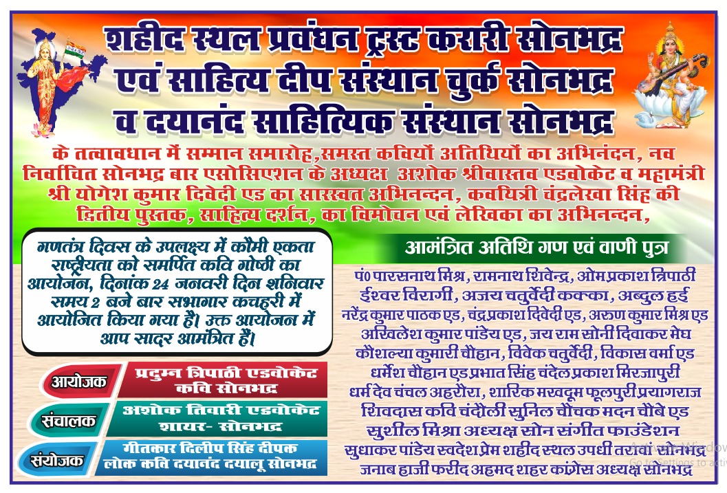 जिसमें शारिक मखदूम फूलपुर प्रयागराज, शिवदास चंदौली, प्रकाश मिरजापुरी, धर्म देव चंचल अहरौरा, रामनरेश पाल वाराणसी के अलावा जनपद के लब्धप्रतिष्ठ कवियों का काव्य पाठ होगा। नवनिर्वाचित सोनभद्र बार एसोसिएशन के अध्यक्ष अशोक प्रसाद श्रीवास्तव एडवोकेट व महामंत्री योगेश कुमार दिवेदी एड का अभिनंदन होगा। गणतंत्र दिवस के उपलक्ष्य में उक्त आयोजन किया गया है । उक्त आशय की जानकारी प्रदुम्न त्रिपाठी एडवोकेट ने दी है।