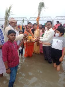 व्रती महिलाओं के साथ परिवार के लोग भी सिर पर दउरा लेकर पूजा के लिए घाटों पर पहुंचे ढोलक तथा अन्य वाद्य यंत्रों की धुन पर मंगल गीत गाते हुए महिलाओं की टोली घाटों की तरफ बंढ़ रही थी शाम चार बजे से ही घाटों पर श्रद्धालुओं की भीड़ जुटनी शुरू हो गई थी सभी ने विधि विधान से छठ माता की पूजा कर हर व्रती महिलाओं ने सिंदूर का लंबा टीका लगाकर पूजन अर्चन किया ।नदियों तलाबों में खड़ी होकर महिलाओं ने भगवान को अघर्य दिया अर्घ्य देने के बाद घाट से जलता हुआ दीपर लेकर घर वापस लौंटी छठ माता की पूजा के लिए सुबह से घरों में तैयारी चल रही थी दउरा फल और पूजा सामग्री सजाने के साथ सामानों को जुटाने में महिलाएं जुटी रहीं भगावन भाष्कर को अर्घ्य देने के लिए सभी स्थानों पर दोपर तीन बजे से ही भीड़ जुटने लगी थी।