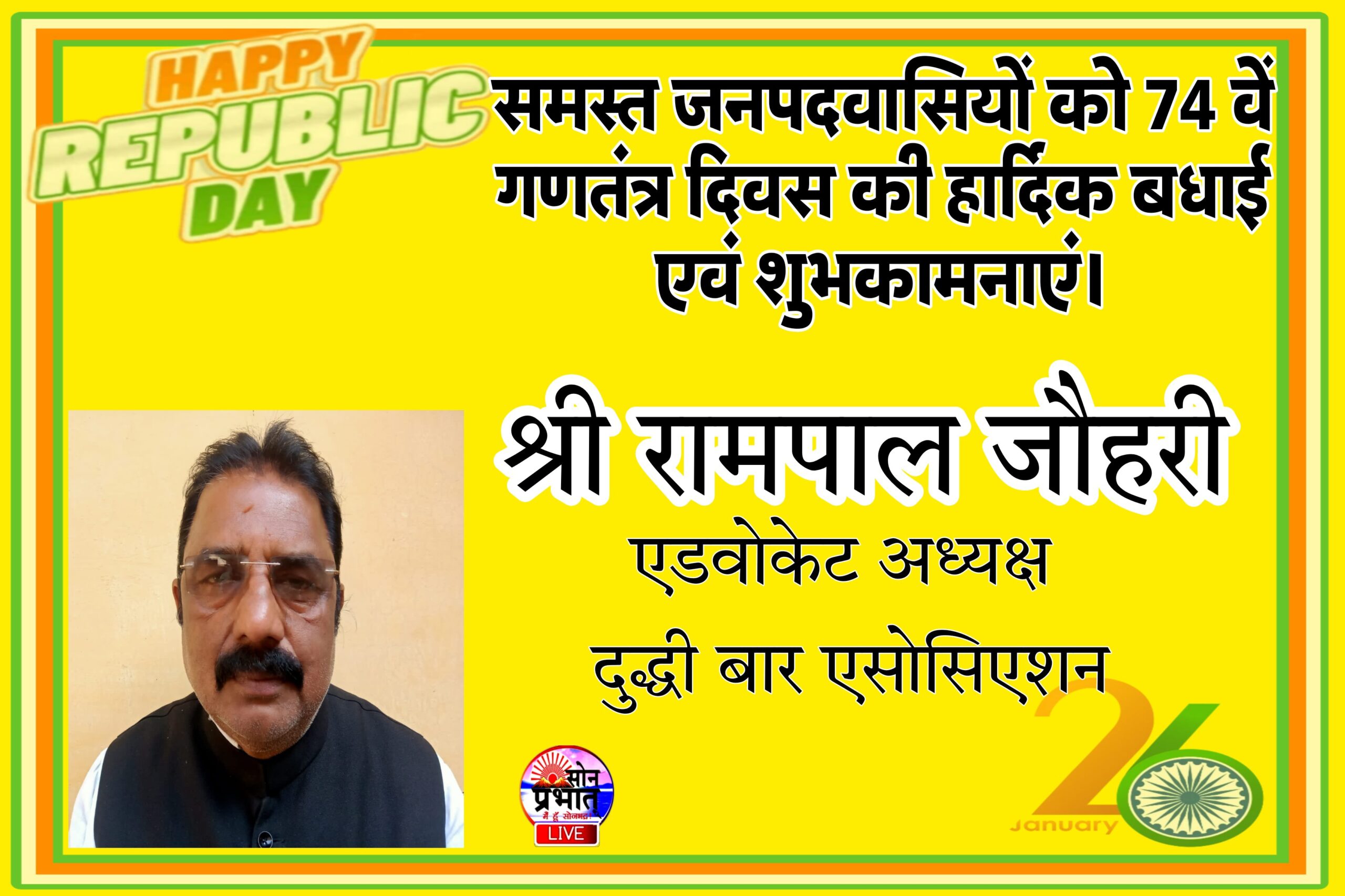 श्री रामपाल जौहरी एडवोकेट अध्यक्ष दुद्धी बार एसोसिएशन नें 74 वें गणतंत्र दिवस के अवसर पर समस्त जनपदवासियों‚ ग्रामवासियों को हार्दिक बधाई व शुभकामनाएं ज्ञापित की है।