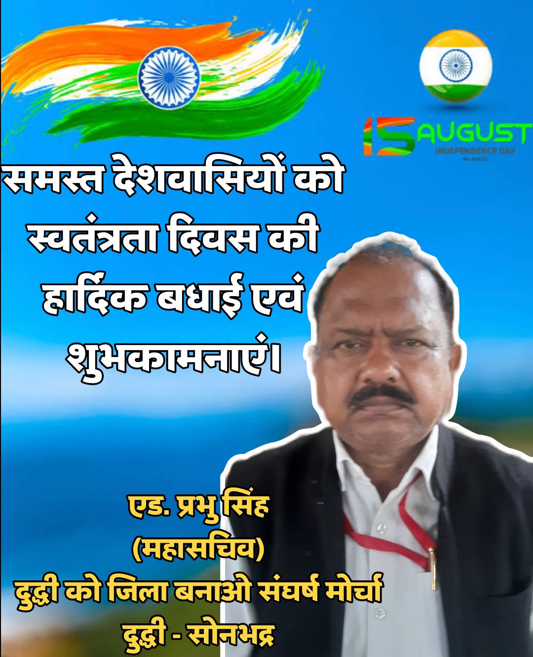 एड० प्रभु सिंह(दुद्धी को जिला बनाओ संघर्ष मोर्चा महासचिव) के तरफ से स्वतंत्रता दिवस की हार्दिक बधाई एवं शुभकामनाएं।