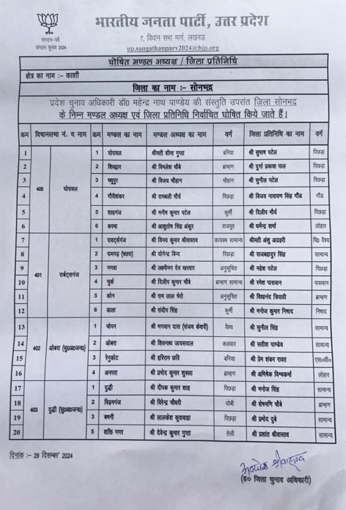 यह है सोनभद्र जिले के लिए भारतीय जनता पार्टी (BJP) के मण्डल अध्यक्षों और जिला प्रतिनिधियों की पूरी सूची: