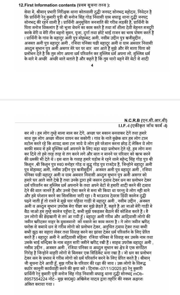 दुद्धी थाना क्षेत्र के ग्राम बघाडू निवासी रेनु कुमारी पुत्री मनोज सिंह गोंड़, जो अनुसूचित जनजाति वर्ग की गरीब परिवार से संबंध रखती हैं, ने पुलिस को दी गई तहरीर में आरोप लगाया है कि गांव के बहादुर अली पुत्र मोहम्मद अली, नसीम उद्दीन पुत्र खजीम उद्दीन, अजमत अली पुत्र बहादुर अली, रजिया पनिका पत्नी बहादुर अली तथा ग्राम अमवार निवासी अब्दुल सुभान पुत्र असगर अली लगातार उसके घर आते-जाते रहे और परिवार को धर्म परिवर्तन के लिए बहलाने-फुसलाने का प्रयास करते रहे।