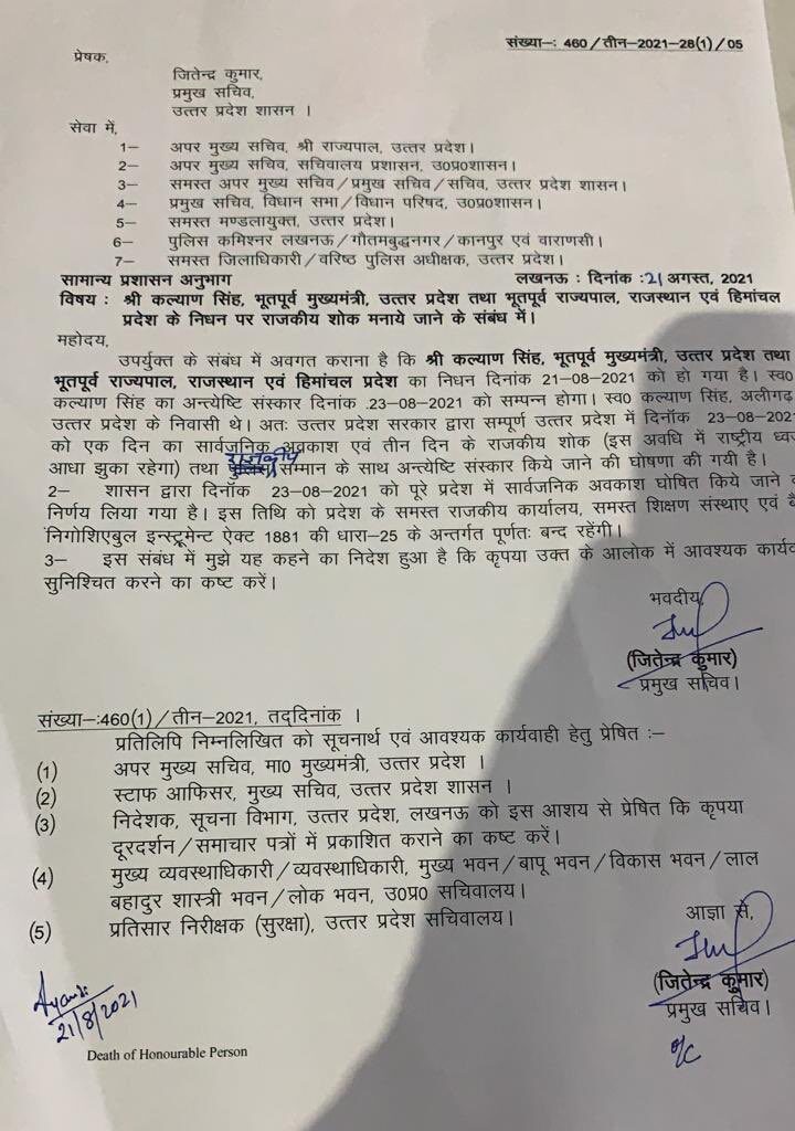 राजकीय शोक – पूर्व मुख्यमंत्री कल्याण सिंह के निधन पर एक दिवसीय अवकाश व 3 दिन के लिए राजकीय शोक की घोषणा। August 22, 2021 12:18 PM