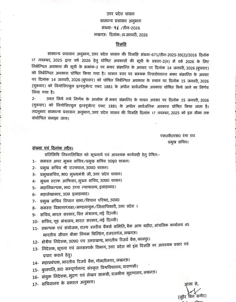उत्तर प्रदेश शासन के सामान्य प्रशासन अनुभाग द्वारा मकर संक्रांति पर्व को लेकर घोषित अवकाश में आंशिक संशोधन किया गया है। शासन द्वारा जारी नवीन विज्ञप्ति संख्या