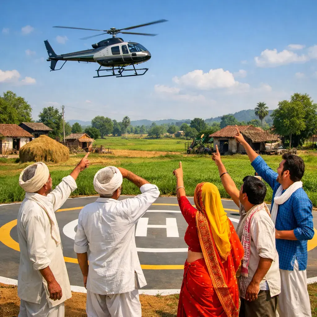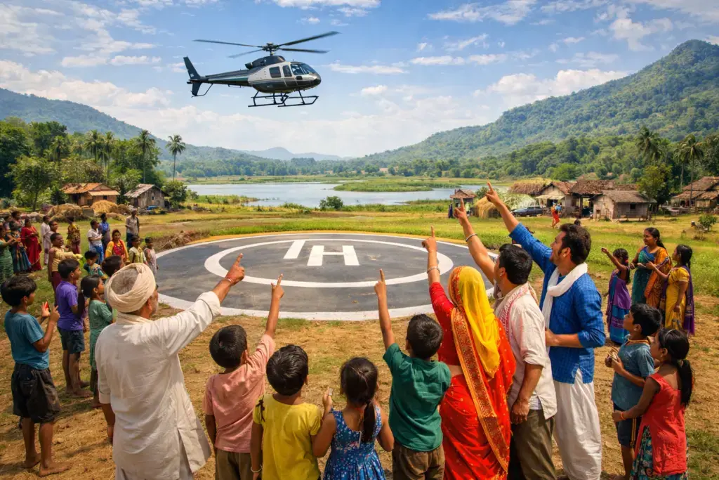 प्रतीकात्मक तस्वीर : AI[/caption] मज़दूर भाई जो अब तक ईंट-भट्ठों और खदानों में पसीना बहाता था, वह अब सुबह हेलीकॉप्टर से साइट पर उतरेगा और शाम को हवा में ही घर लौटेगा। और आदिवासी समाज—जो आज भी सड़क, स्वास्थ्य और शिक्षा के लिए संघर्ष कर रहा है—वह अब नक्शे पर नहीं, हवाई रूट चार्ट पर दिखाई देगा। सच कहूँ तो मुझे अपने बचपन की याद आती है। जब हम देखते थे, बीमार को खाट पर बाँधकर किलोमीटरों पैदल ले जाया जाता था। तब किसी ने नहीं सोचा था कि समस्या सड़क की है या अस्पताल की। लेकिन आज समाधान बिल्कुल स्पष्ट है— हेलीपैड। [caption id="attachment_71745" align="aligncenter" width="1024"]