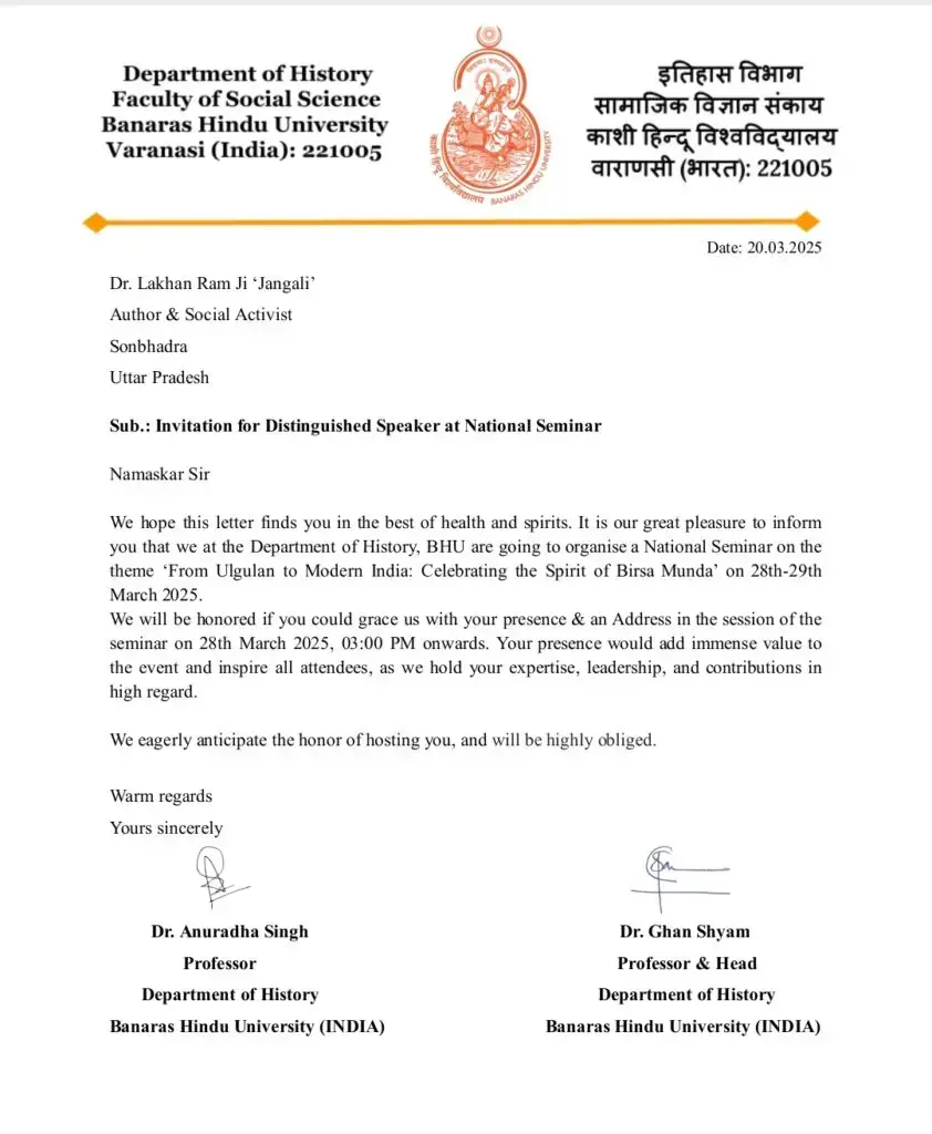 फाइल फोटो : डॉ. लखन राम जंगली[/caption] बीएचयू के इतिहास विभाग की ओर से प्रो. डॉ. अनुराधा सिंह एवं विभागाध्यक्ष प्रो. डॉ. घनश्याम द्वारा भेजे गए आमंत्रण पत्र में डॉ. लखन राम 'जंगली' को 28 मार्च 2025 को दोपहर 3:00 बजे होने वाले सत्र में अपना संबोधन देने के लिए आमंत्रित किया गया है। पत्र में उल्लेख किया गया है कि उनके विद्वतापूर्ण विचार एवं समाज में दिए गए योगदान इस संगोष्ठी को एक नई दिशा देंगे।