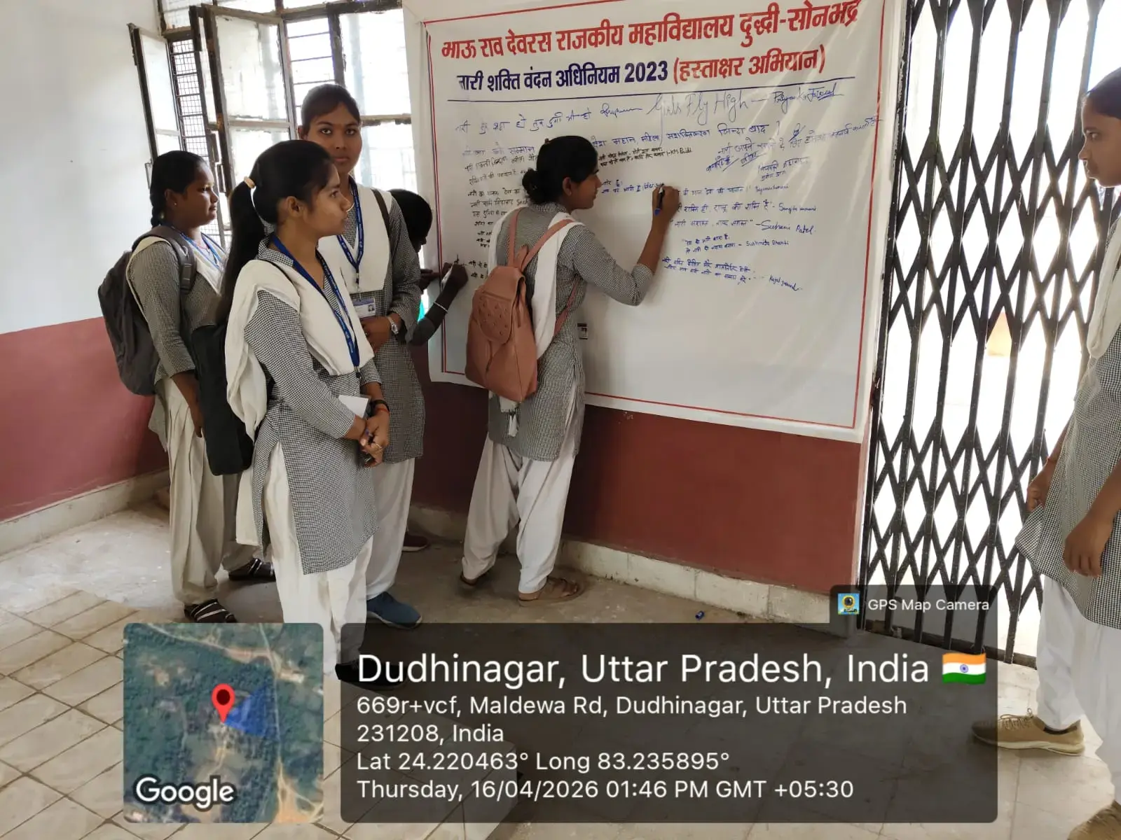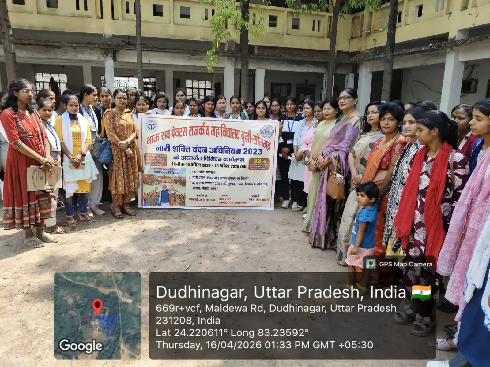 दुद्धी सोनभद्र भाऊ राव राजकीय स्नातकोत्तर महाविद्यालय दुद्धी सोनभद्र में नारी शक्ति वंदन अधिनियम 2023 (महिला आरक्षण) के व्यापक प्रचार-प्रसार एवं महिला सशक्तिकरण और समाज में उनकी भागीदारी बढ़ाने के उद्देश्य से दिनांक 10 अप्रैल 2026 से 20 अप्रैल 2026 तक एक भव्य नारी शक्ति पदयात्रा एवं नारी शक्ति हस्ताक्षर मानव श्रृंखला अभियान का आयोजन किया गया। इस कार्यक्रम में महाविद्यालय के समस्त छात्र-छात्राओं ने प्रतिभाग किया। यह अभियान महिलाओं के एक ऐतिहासिक व सामाजिक बदलाव और नारी शक्ति को बढ़ावा देने के प्रति समाज की सकारात्मक पहल है। कार्यक्रम का शुभारंभ मुख्य अतिथि ब्लॉक प्रमुख रंजना चौधरी, विशिष्ट अतिथि ममता मौर्या कार्यक्रम की अध्यक्षता भाऊ राव देवरस राजकीय स्नातकोत्तर महाविद्यालय दुद्धी के प्रभारी प्राचार्य राजेश भारती की अध्यक्षता में हुआ।