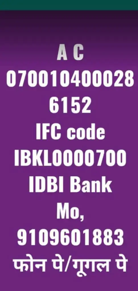 सोनप्रभात संवाददाता दिनेश चौधरी ने डिजिटल पे के माध्यम से किया सहयोग।[/caption] आपके सहयोग से किसी का जीवन बचाया जा सकता है। सहयोग राशि आप निम्न दिए गए खाता नम्बर या डिजिटल पेमेंट के माध्यम से कर सकते है।