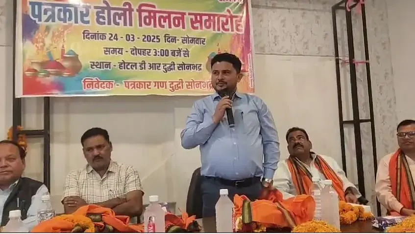 दुद्धी, सोनभद्र -उत्तर प्रदेश के सोनभद्र जिले के दुद्धी कस्बे में इस बार होली का रंग कुछ अलग ही नजर आया। यहां पहली बार पत्रकारों ने प्रशासनिक अधिकारियों और समाज के गणमान्य लोगों के साथ मिलकर फूलों की होली खेली और समरसता का संदेश दिया। डी.आर. होटल में आयोजित "पत्रकार होली मिलन समारोह" ने न केवल रंगों का उत्सव मनाया, बल्कि भाईचारे और एकता की मिसाल भी कायम की। इस ऐतिहासिक आयोजन के मुख्य अतिथि उप जिलाधिकारी (न्यायिक) दुद्धी अश्वनी कुमार रहे, जिन्होंने फूलों की वर्षा के बीच सभी को होली की शुभकामनाएं दीं।