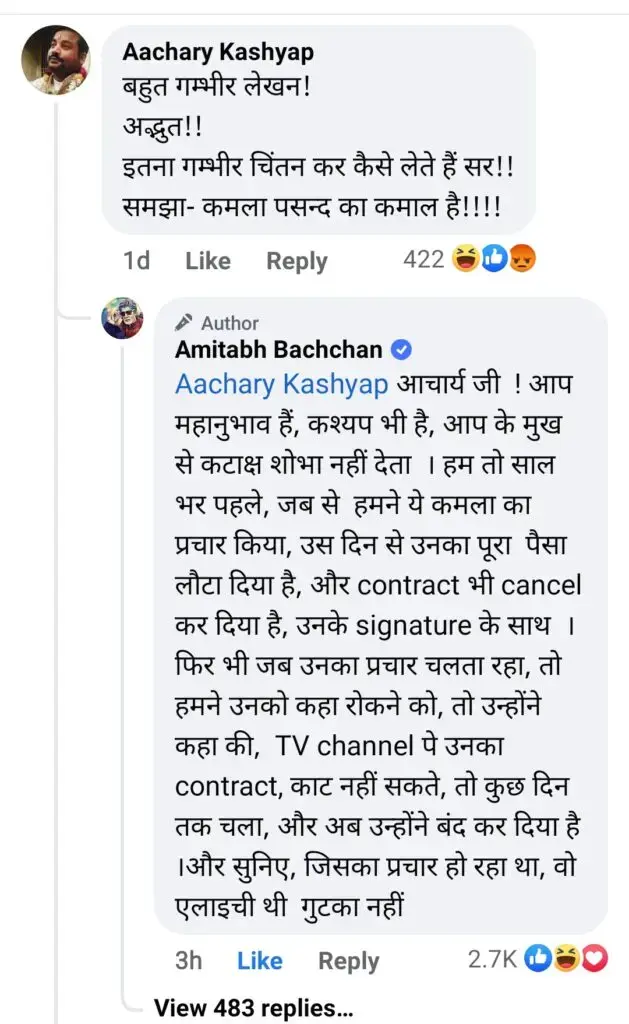 अमिताभ बच्चन जी ने लिखा - : आचार्य जी ! आप महानुभाव हैं, कश्यप भी है, आप के मुख से कटाक्ष शोभा नहीं देता। हम तो साल भर पहले, जब से हमने ये कमला का प्रचार किया, उस दिन से उनका पूरा पैसा लौटा दिया है, और contract भी cancel कर दिया है, उनके signature के साथ। फिर भी जब उनका प्रचार चलता रहा, तो हमने उनको कहा रोकने को, तो उन्होंने कहा की, TV channel पे उनका contract, काट नहीं सकते, तो कुछ दिन तक चला, और अब उन्होंने बंद कर दिया है। और सुनिए, जिसका प्रचार हो रहा था, वो एलाइची थी गुटका नहीं।