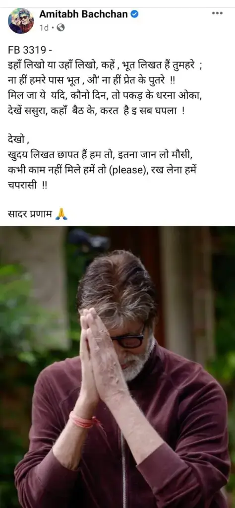 (ऑफिसियल फेसबुक वाल से) बात है 9 जून 2022 की जब अमिताभ बच्चन (Amitabh Bachchan) जी ने अपने फेसबुक पेज पर एक खुद की लिखी हुई एक पोस्ट शेयर की, पोस्ट के शेयर होते ही फैंस के कमेंट का सिलसिला शुरू हुआ, कुछ लोग उनकी लेखन से प्रभावित होकर अच्छी अच्छी टिप्पणियां की तो कुछ लोग उन्हे ट्रोल करते दिखाई पड़े, दरअसल पिछले दिनों अमिताभ बच्चन (Amitabh Bachhan) जी कमला पसंद (Kamla Pasand) के विज्ञापन के लिए खूब ट्रोल हुए थे, तब उन्होंने तमाम तरह के तर्क देकर खुद को सही साबित करने की कोशिश की थी।