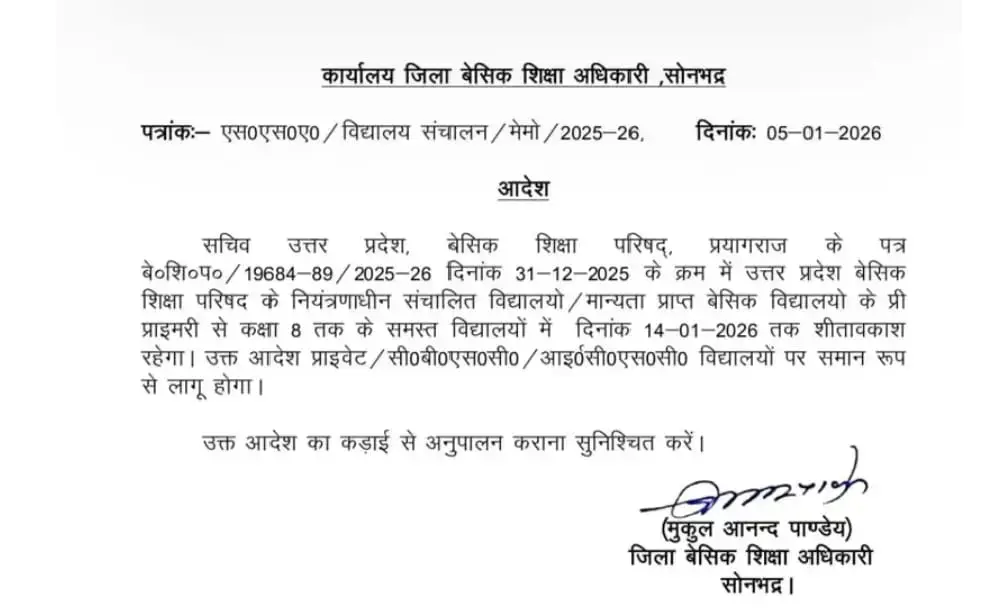 सोनभद्र कक्षा 01से लेकर 08 तक 14 जनवरी 2026 तक बंद रहेंगे सभी विद्यालय- जिला बेसिक शिक्षा अधिकारी सोनभद्र