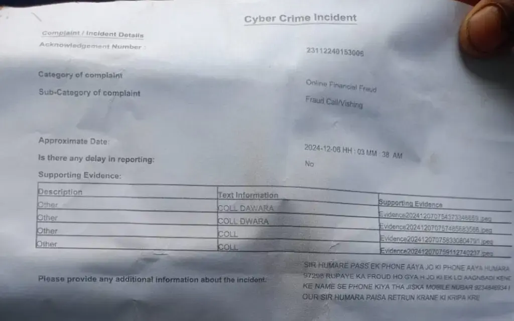 बात बीते 6 दिसम्बर की बताई गई, दिन में लगभग 3:30 बजे श्यानारायण के पास एक अनजान नंबर ( 9234846934) से फोन कॉल आता है, और उधर से श्यानारायण के घर के सदस्यों के बारे में पूरी जानकारी बताई जाती है। कॉलर ने बताया कि आपके पत्नी के डिलीवरी (प्रसव) का पहला किश्त आपके खाते में नहीं जा रहा है, अगर आप गूगल पे या फोन पे प्रयोग करते हो तो खाते में पहला किश्त की रकम भेज दी जाएगी। श्यामनारायण ने अपने पत्नी के खाते से लिंक गूगल पे नम्बर बता दिया और उसके बाद फ्रॉड कॉलर ने दो तीन बार ओ टी पी भेज कर सभी ओ टी पी श्यानारायण से पूछा और अपने साथ हो रहे फ्रॉड से अंजान श्यानारायण बार बार ओ टी पी बताते गया। तीन बार ट्रांसफर करके कुल 97 हजार 298 रुपए श्यामनारायण की पत्नी मानमती के खाते से निकाले जा चुके थे। जब बाद में फोन करके कॉलर से पूछा गया तो जवाब मिला दो तीन दिन में पैसा वापस आ जाएगा, कहीं किसी को बताने की जरूरत नहीं है।