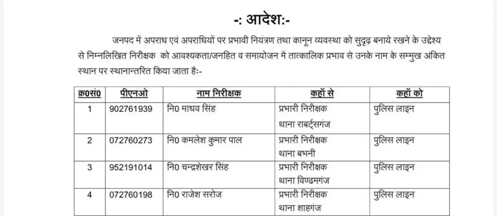प्राप्त जानकारी के अनुसार लाइन हाजिर किए गए थाना प्रभारियों में रावर्ट्सगंज थाना प्रभारी माधव सिंह , बभनी थाना प्रभारी कमलेश पाल , विंढमगंज थाना प्रभारी चन्द्रशेखर सिंह तथा शाहगंज थाना प्रभारी राजेश कुमार सरोज शामिल हैं।