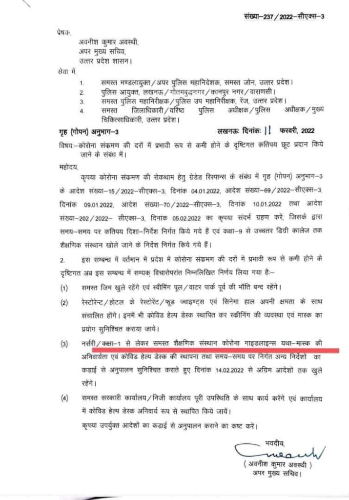 कोरोना वायरस का संक्रमण कम होने के बाद अब उत्तर प्रदेश सरकार ने सभी स्कूलों को फिर से खोलने का फैसला लिया गया है। 14 फरवरी से राज्य में नर्सरी से लेकर कक्षा आठ तक के सभी सरकारी और निजी स्कूल खोले जाएंगे। आनलाइन कक्षाएं नहीं चलेंगी। मुख्य सचिव गृह अवनीश कुमार अवस्थी ने आदेश जारी कर दिए हैं। आपको बताते चले कि पिछले सप्ताह कक्षा नौ से लेकर इंटरमीडिएट तक के माध्यमिक स्कूल, विश्वविद्यालय और डिग्री कालेजों को खोलने का फैसला लिया गया था।