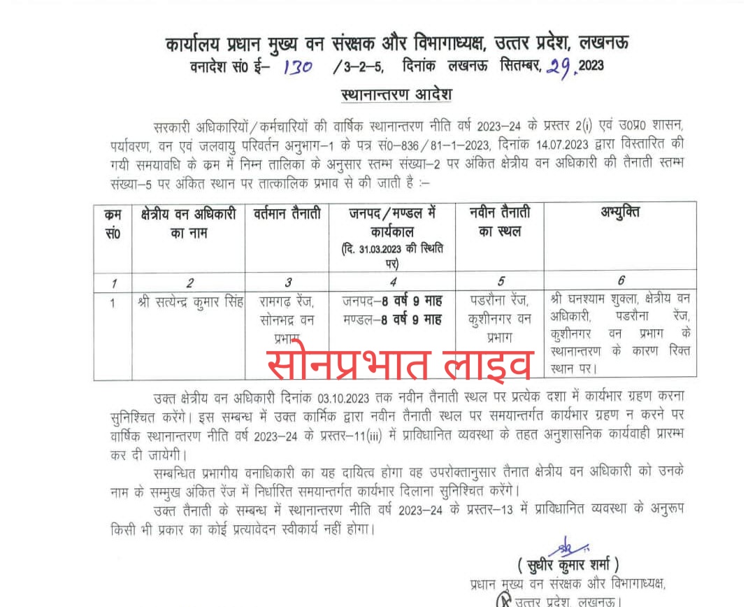 सोनभद्र वन प्रभाग के रामगढ़ रेंज के वन क्षेत्राधिकारी सत्येन्द्र कुमार सिंह का कुशीनगर तबादला हो गया है। बतादें कि इन्होंने मंडल में आठ वर्ष नौ माह और जिले में आठ वर्ष नौ माह की सेवा दे चुके हैं।२९ सितम्बर को ही श्री सुधीर कुमार शर्मा प्रधान मुख्य वन संरक्षक एवं विभागाध्यक्ष उत्तर प्रदेश लखनऊ के द्वारा कर दिया गया है। श्री सत्येन्द्र कुमार सिंह तब चर्चा में आए जब केवटम गांव में एक आदिवासी अपने घर के सामने भैंस दूह रहे थे।उनको बूरी तरह से मार पीट कर घायल कर दिए थे। तथा विरोध करने पर आधा दर्जन लोगों को पीटा गया था। फायरिंग भी किए थे। इस सम्बन्ध में दोनों तरफ से मुकदमा दर्ज किया गया है। उन्तीस सितम्बर को तबादला हुआ है लेकिन अब तक वहीं डटे हुए हैं।केवटम गांव के ग्रामीणों की मांग है कि तत्काल उन्हें कार्यमुक्त किया जाय।