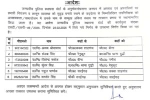 एसपी द्वारा जारी आदेश के अनुसार, दुद्धी एसएसआई रहे कुँवर सिंह को रेणुकूट चौकी इंचार्ज, सरईगढ़ चौकी इंचार्ज रहे राहुल पांडेय को शाहगंज कस्बा चौकी इंचार्ज, शाहगंज चौकी इंचार्ज रहे अजय श्रीवास्तव को बीना चौकी इंचार्ज, बीना चौकी इंचार्ज रहे जितेंद्र सरोज को पनौरा चौकी का प्रभार सौंपा गया है साथ ही रेणुकूट चौकी इंचार्ज रहे संजय सिंह को दुद्धी एसएसआई और एसआई शमशेर सिंह को सरईगढ़ चौकी का प्रभारी बनाया गया है।