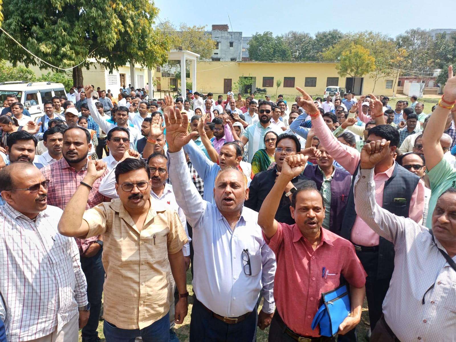 - सभी संगठनों के शिक्षक नेताओं की अगुवाई मे किया गया विरोध प्रदर्शन।