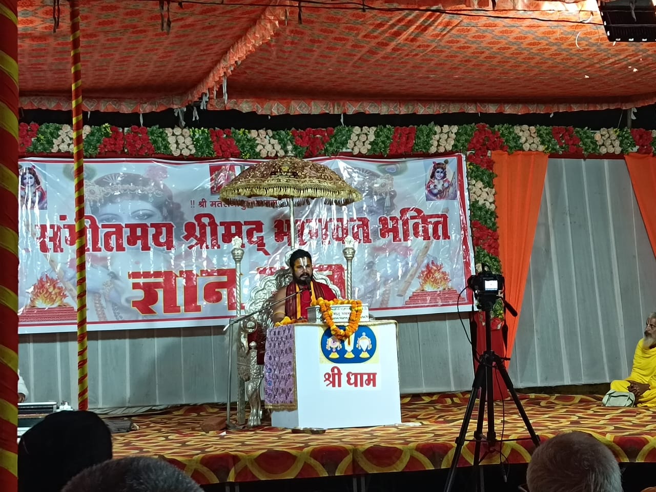संगीतमयी कथा के दौरान पूज्य महाराज श्री ने श्रीमद् भागवत पुराण के अनुसार प्रेम के नौ रूपों — रति, प्रेम, स्नेह, मान, प्रणय, राग, अनुराग, भाव, और महाभाव — का सुंदर विवेचन करते हुए ब्रजधाम के मर्मस्पर्शी वर्णन से उपस्थित श्रद्धालुओं को भक्ति रस में सराबोर कर दिया।