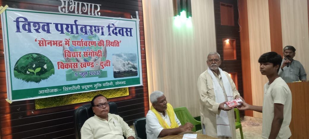 दुद्धी, सोनभद्र। 5 जून 2025 को विश्व पर्यावरण दिवस के अवसर पर दुद्धी ब्लॉक सभागार में “सिंगरौली प्रदूषण मुक्ति वाहिनी” के संयोजन में एक जागरूकता गोष्ठी का आयोजन किया गया। कार्यक्रम में पर्यावरण संरक्षण, प्रदूषण के दुष्परिणाम और न्यायाधिकरण (NGT) के निर्देशों के अनुपालन को लेकर गंभीर चिंताएं व्यक्त की गईं। मुख्य वक्ता बनवासी सेवा आश्रम गोविंदपुर की महामंत्री शुभा बहन रहीं, जबकि कार्यक्रम की अध्यक्षता रामवृक्ष गौंड ने की।